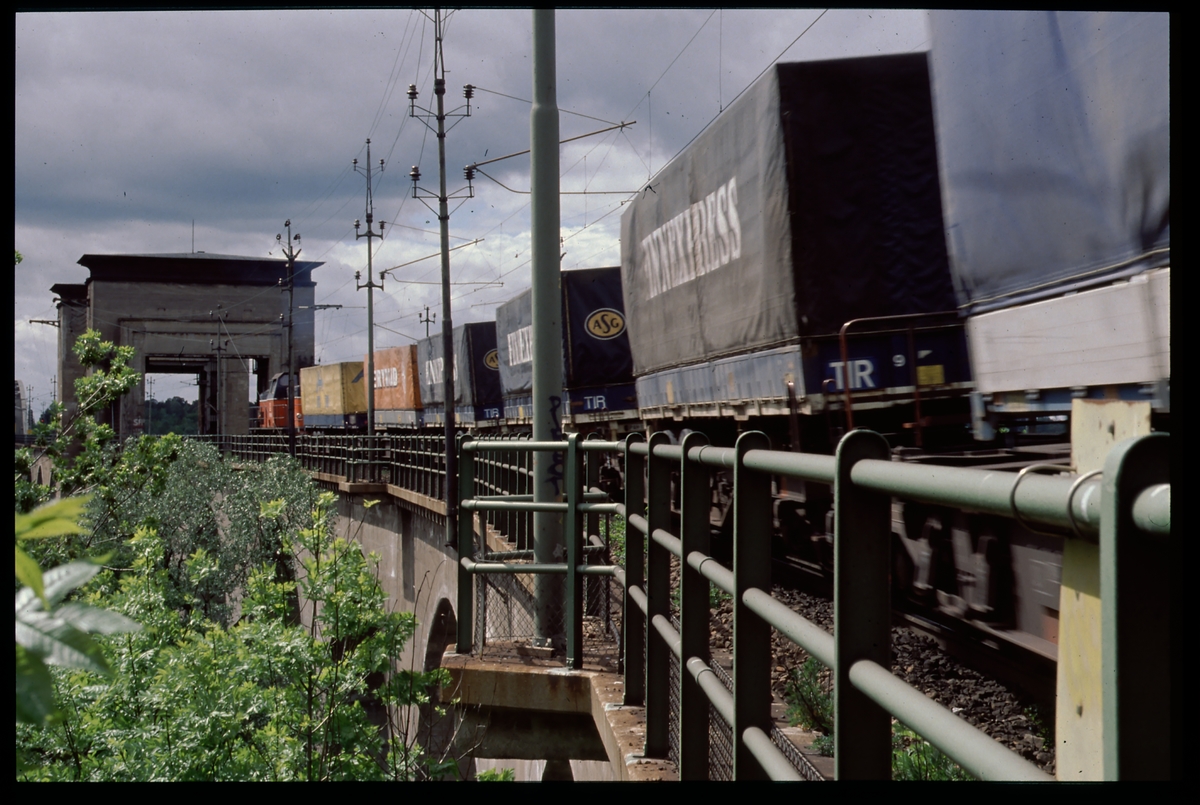Statens Järnvägar, SJ Z 65 med lastade Sdins över Årstabron.