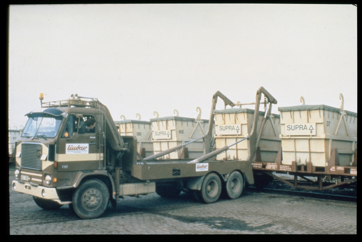 Lossning av container från "Supra" på en vagn Littera SHs.