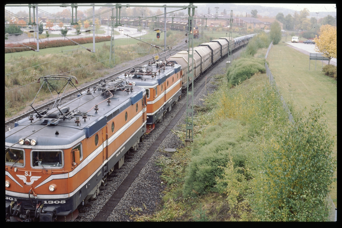 Statens Järnvägar, SJ Rc.1305. Med Sj Shimmns. Och öppna vagnar lastade med stålrullar.