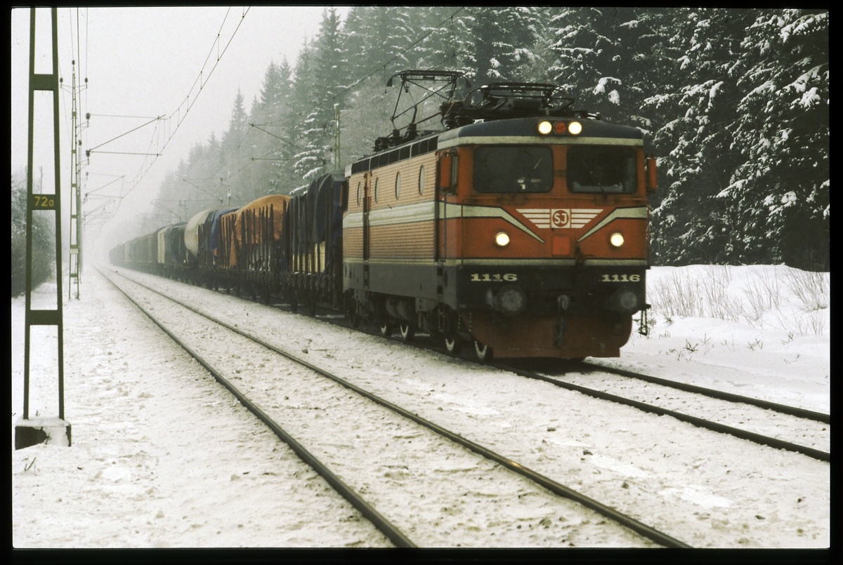 Statens Järnvägar SJ Rc2 1116 med godsvagnar.