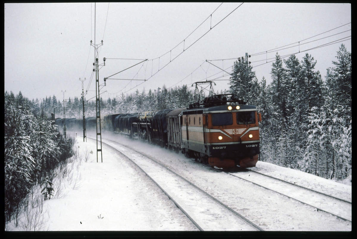 Statens Järnvägar SJ Rc2 1027 med godsvagnar.