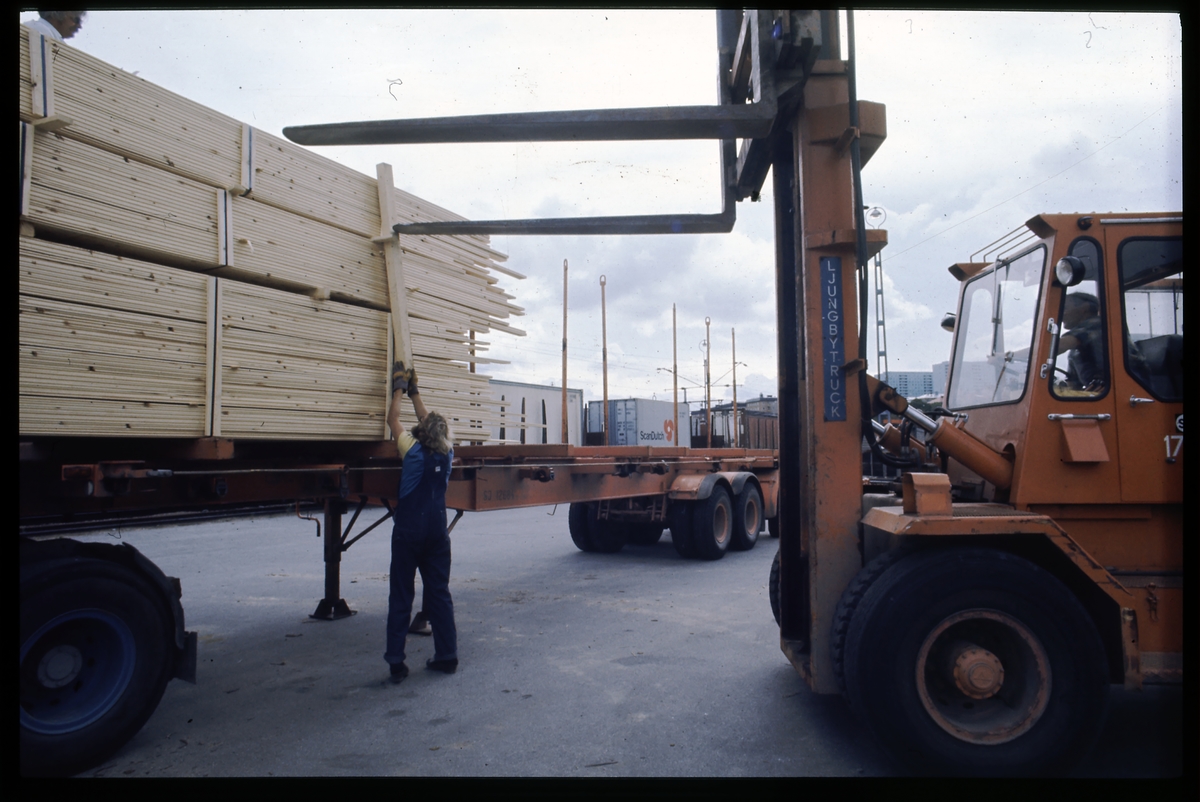 Lastning av virke på lastbilssläp.
