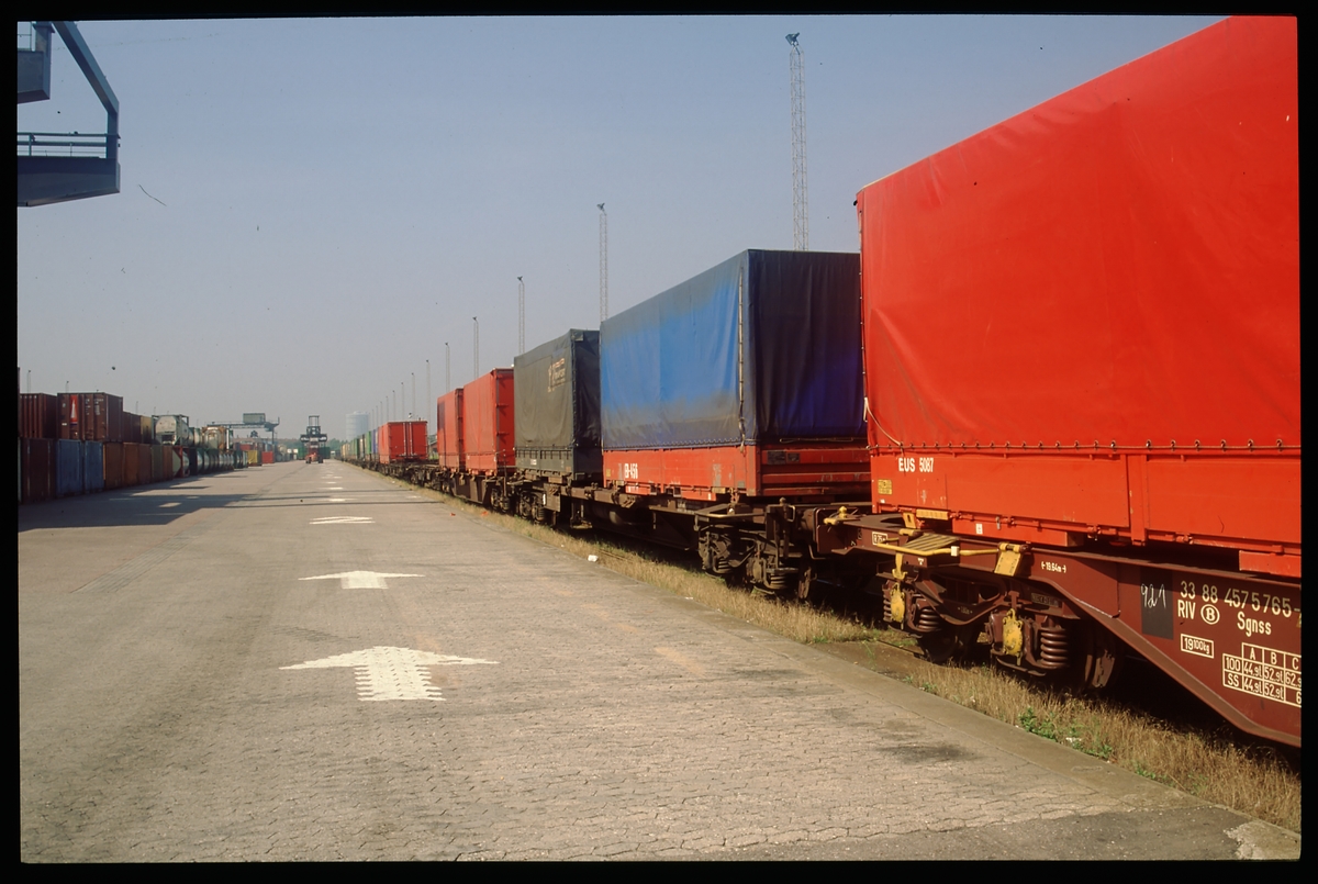 Öppen special flakvagn, Sgnss 33-88-457 5 765-1 med containerlast.