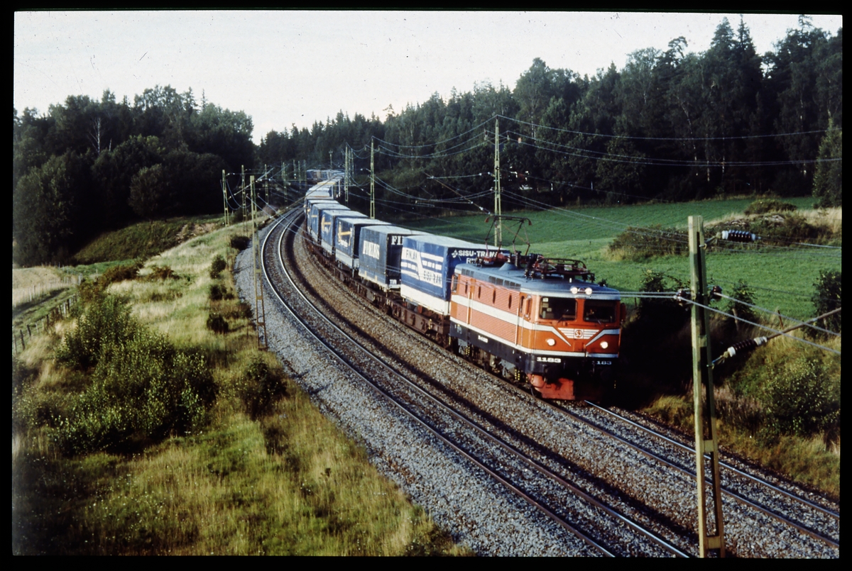 Statens Järnvägar, SJ Rc4 1183 med godsvagnar.