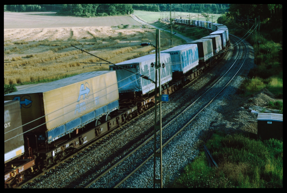 Godståg mede kombigodsvagnar och lastbilssläp.