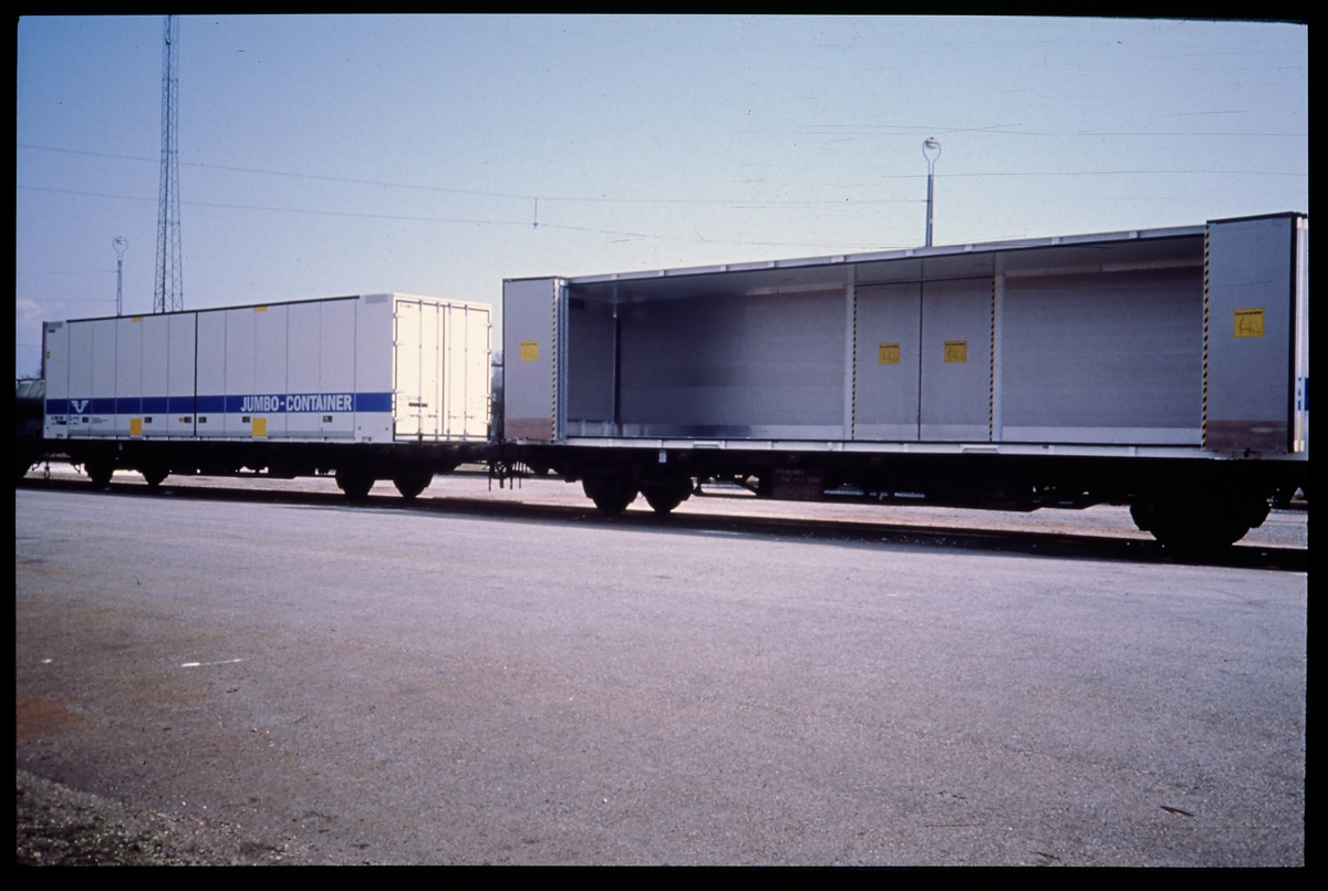 Statens Järnvägar, SJ jumbocontainer 1361 001 och SJ jumbocontainer 1361 002, lastade på godsvagnar. Däribland SJ Lgjs 42-74-440 4 635-8. Statens Järnvägar.