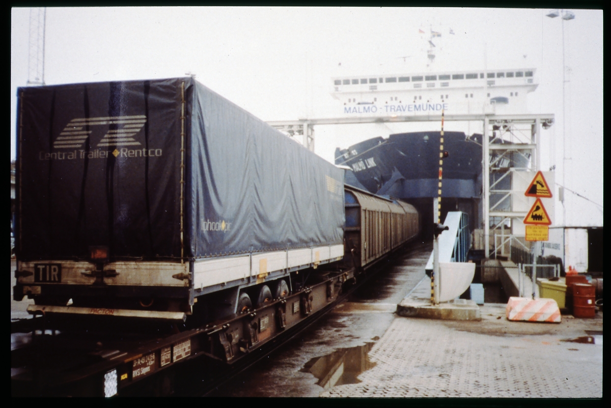 Godsvagnar vid tågfärja på linjen Malmö-Travemünde. Däribland SJ Sdgmns 31-74-451 2 425-6. Statens Järnvägar.