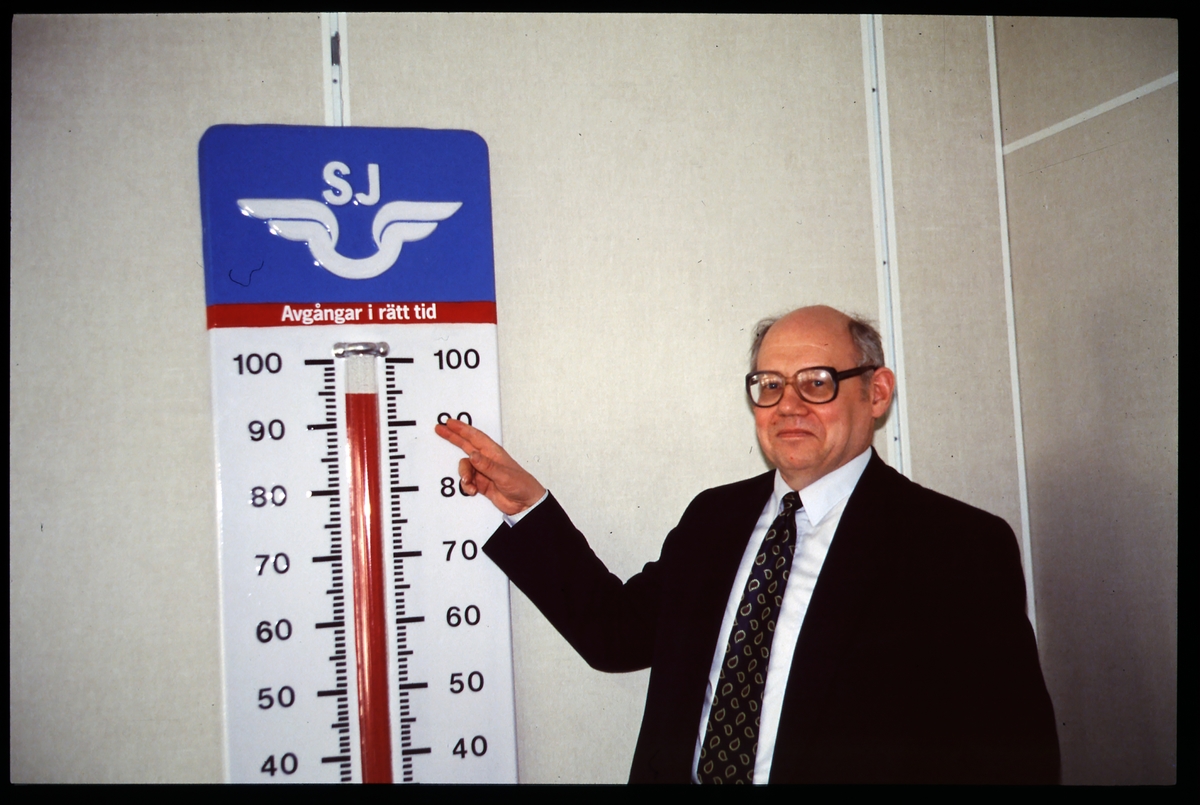 Porträtt av man. Statens Järnvägar, SJ termometer, med texten: Avgångar i rätt tid.