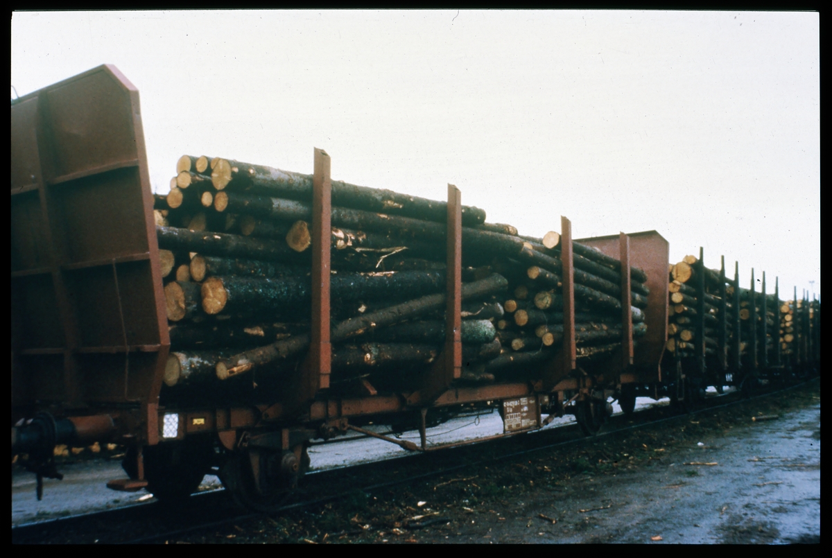 Timmerlastade godsvagnar. Statens Järnvägar, SJ.