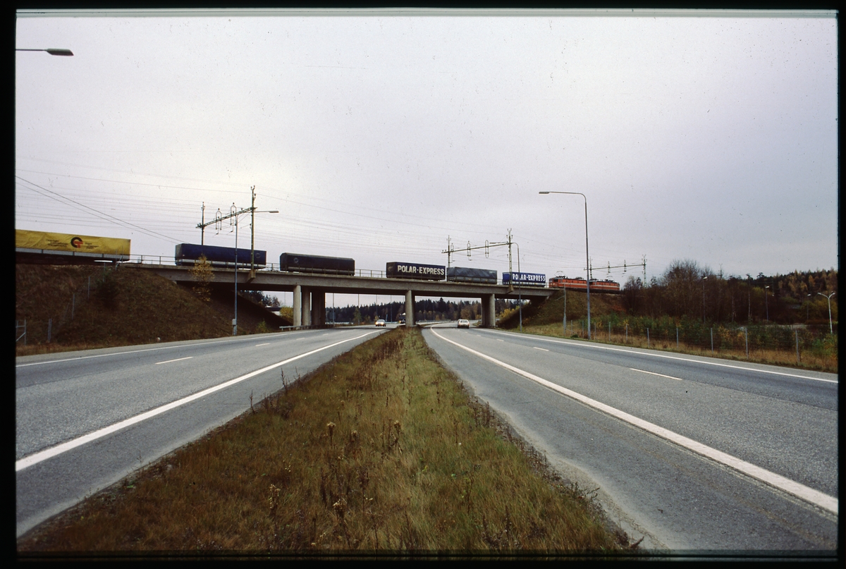 Godståg passerar vägviadukt. Statens Järnvägar, SJ Rc-lok.
