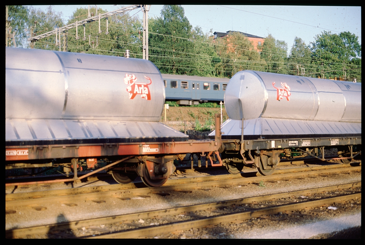 Godsvagnar med mjölkbehållare, däribland SJ Zs 45-74-735 0 007-4. Statens Järnvägar.