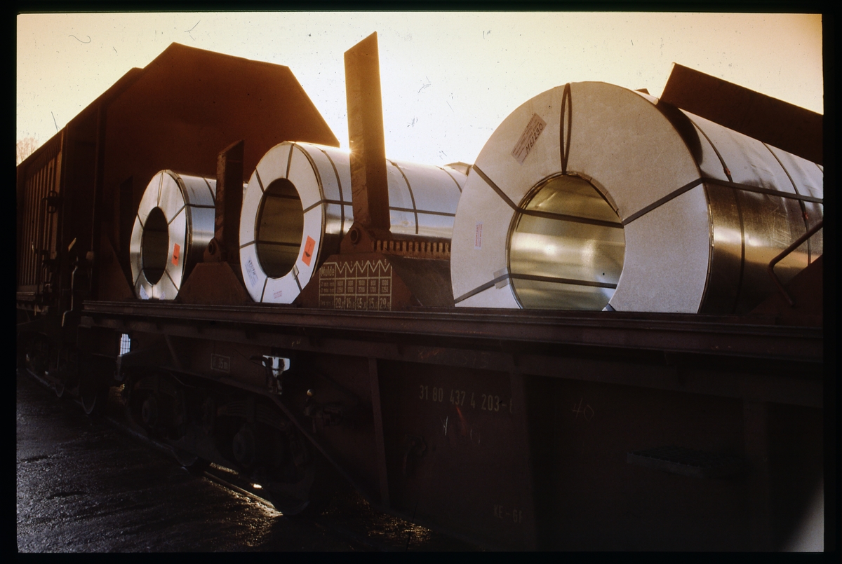 Tysk öppen special flakvagn, Laagooss 31 80 437 4 203-6, lastad med plåtrullar.