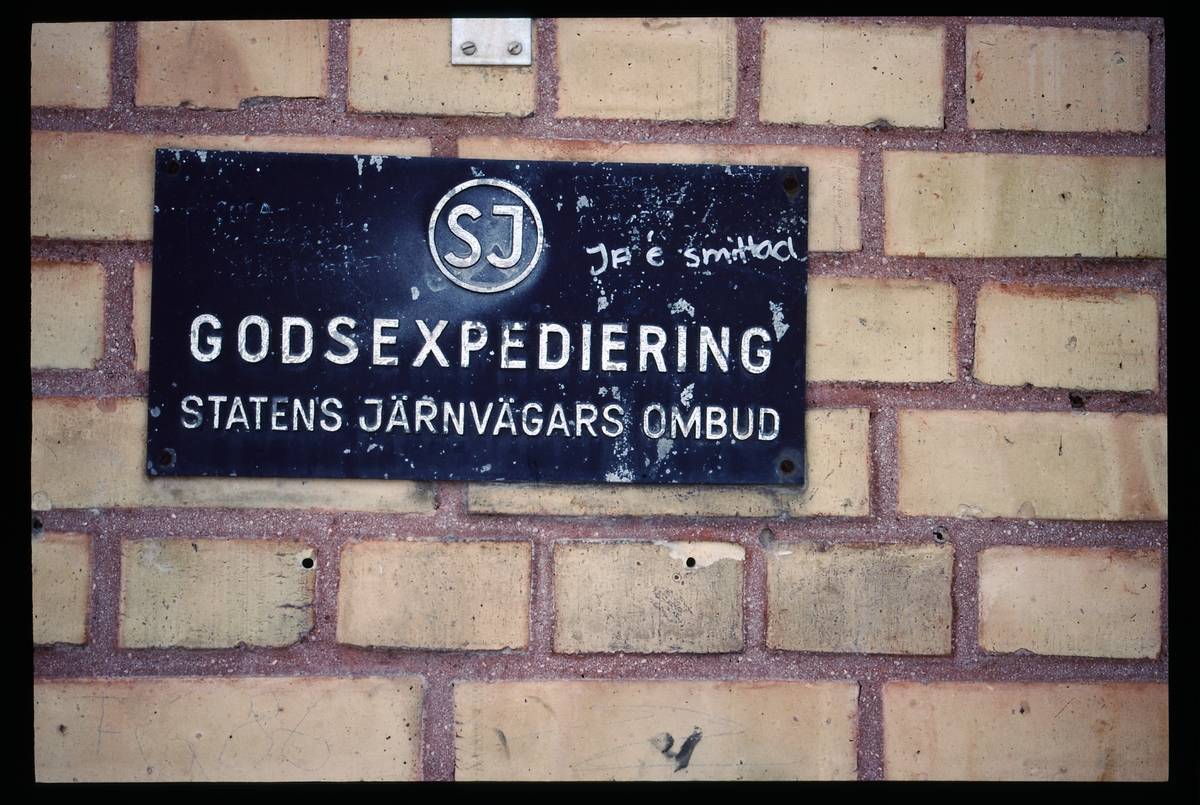 Titel: Skylt på tegelfasad med texten: SJ GODSEXPEDIERING STATENS JÄRNVÄGARS OMBUD.