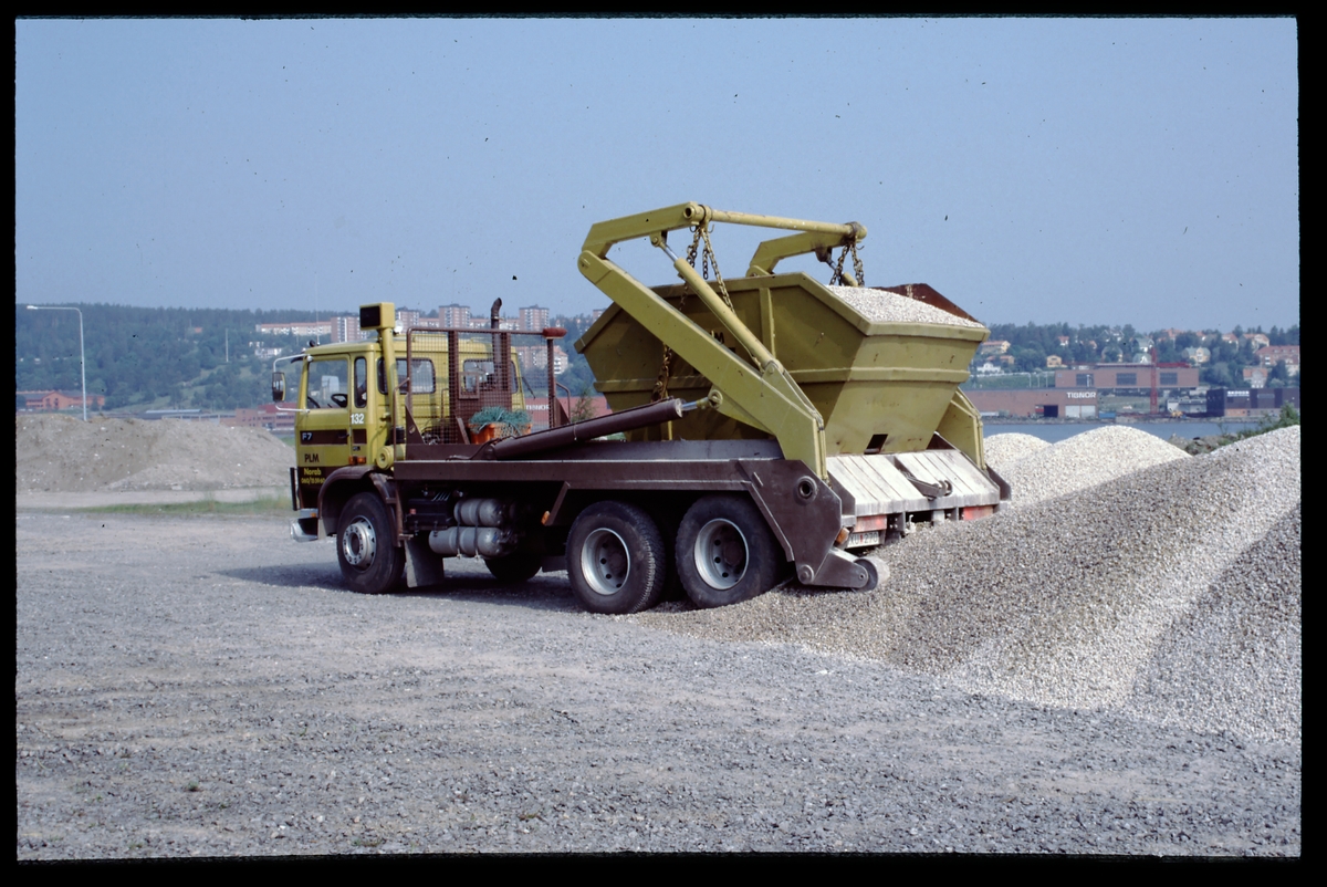 Lastbil med gruscontainer, strax innan lossning av grus.