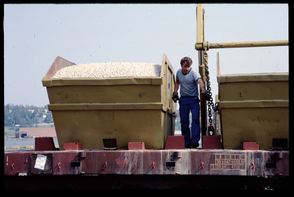 Lossning av gruscontainer från SJ Rs 31-74-390 0 019-9. Statens Järnvägar.