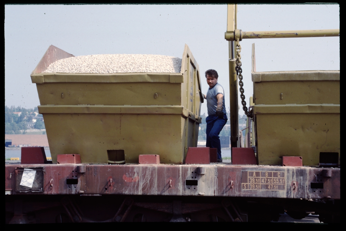 Lossning av gruscontainer från SJ Rs 31-74-390 0 019-9. Statens Järnvägar.