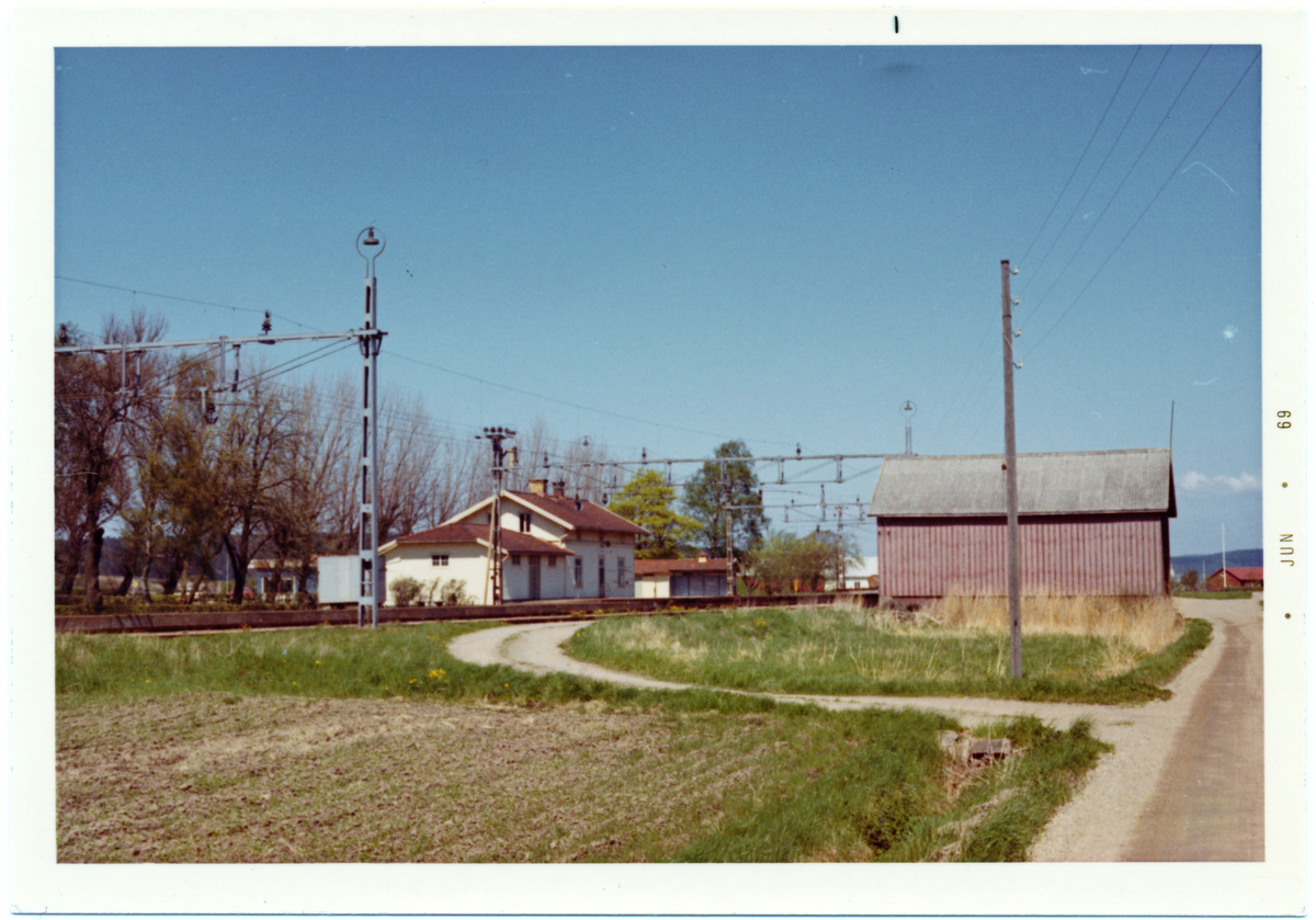 Vy vid Derome. Hette tidigare ÅSBRO. Trafikplats anlagd 1890. Envånings stationshus i trä byggt 1880, sammanbyggt med godsmagasinet. Bostadslägenheten reparerades 1943. Elektrisk växelförregling