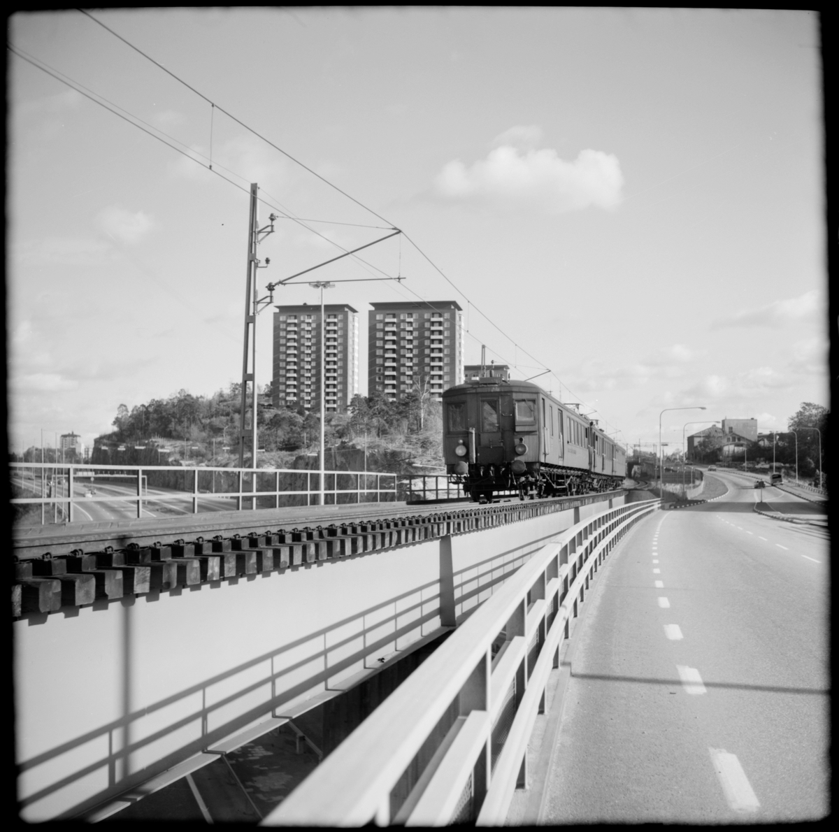 Saltsjöbanan, järnvägsbro mellan Henriksdals station och Sickla station, Stockholm. Till vänster i bild syns delar av riksväg 222 "Värmdöleden".
