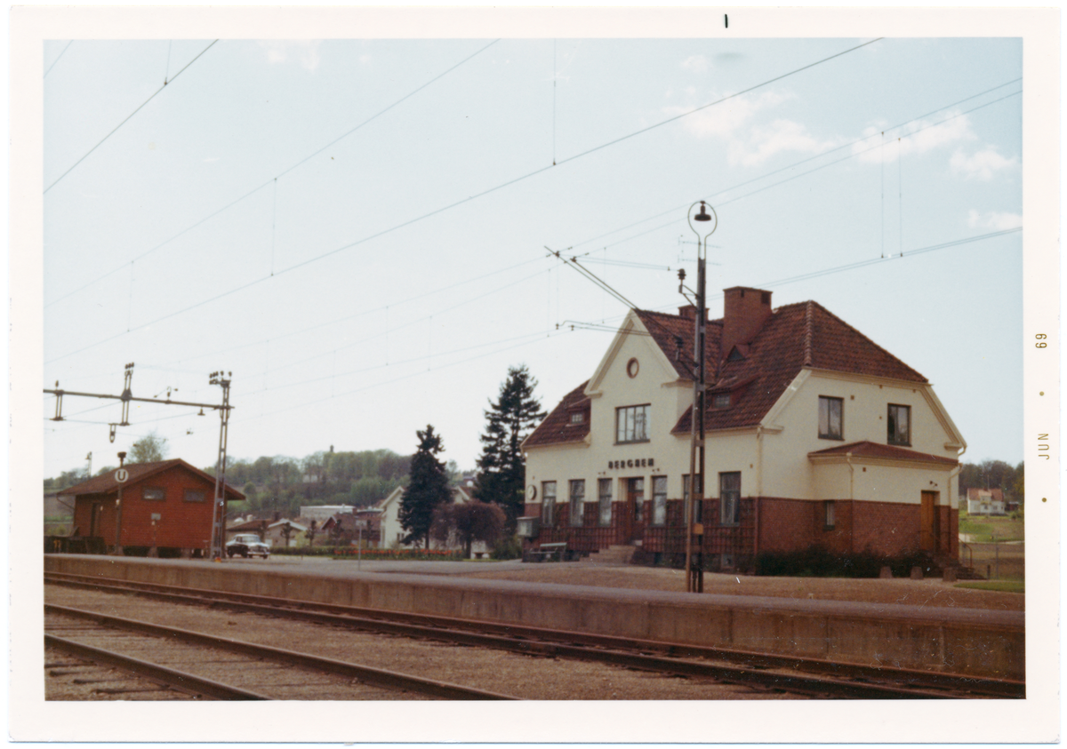 Titel: Vy vid Berghem.Trafikplats anlagd 1918. Tvåvånings putsad stationsbyggnad byggt enligt ritningar av arkitekt Harald Söderberg, Varberg. Elektrisk växelförregling anordnad 1945 . Privatägt, välbevarat hus i 1 1/2 plan med stationsnamnsskylt på spårsidan.Resenärerna hänvisas i dag till en hållplats med plastkur strax söder om stationshuset.Både hållplatsen och stationshuset ligger på spårets västra sida.