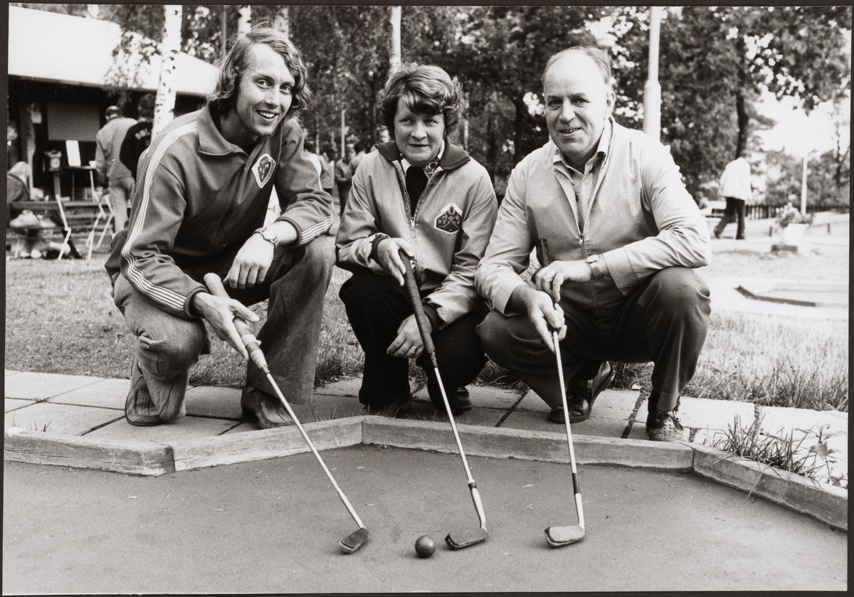 Från vänster: Leif Jansson, Trafikaktiebolaget Grängesberg - Oxelösunds Järnvägar, TGOJ, Ulla Johansson, Statens Järnvägar, SJ Örebro och Ejnar Johansson, TGOJ vid Fröslunda bangolfbana.