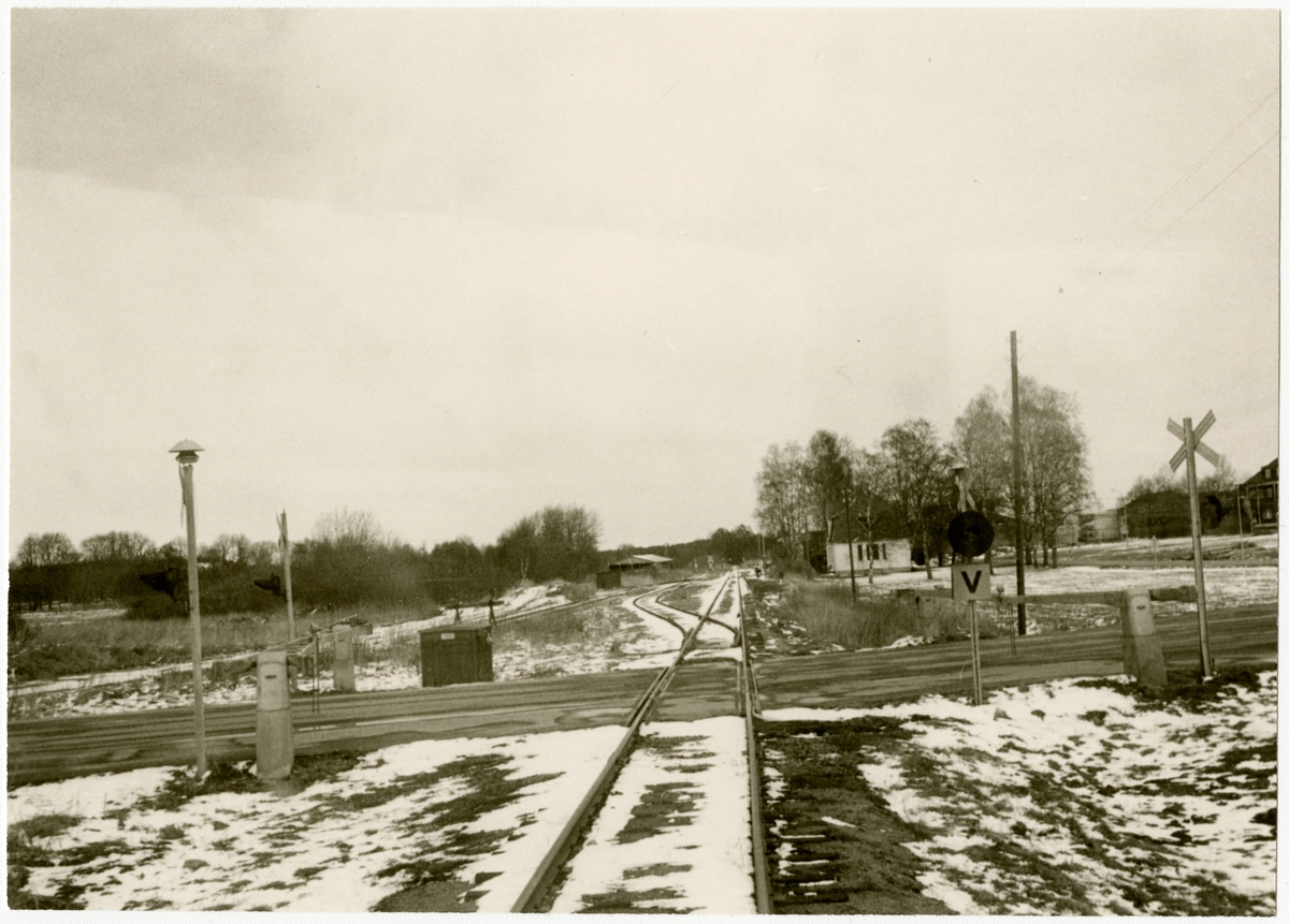 Bevakad järnvägsövergång med varningsskylt, ljussignal, bommar och ljudsignalanordning för trafikanter. Stationen i bakgrunden.