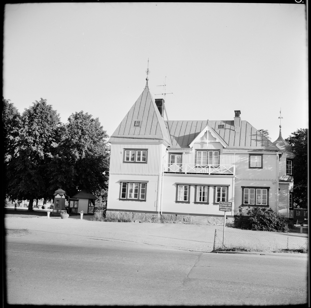 Stationshuset i Mariefred, som användes av Museijärnväg Östra Södermanlands Järnväg, ÖSlJ. Telefonkiosk till vänster om stationshuset. Bilden är tagen från gatusidan.