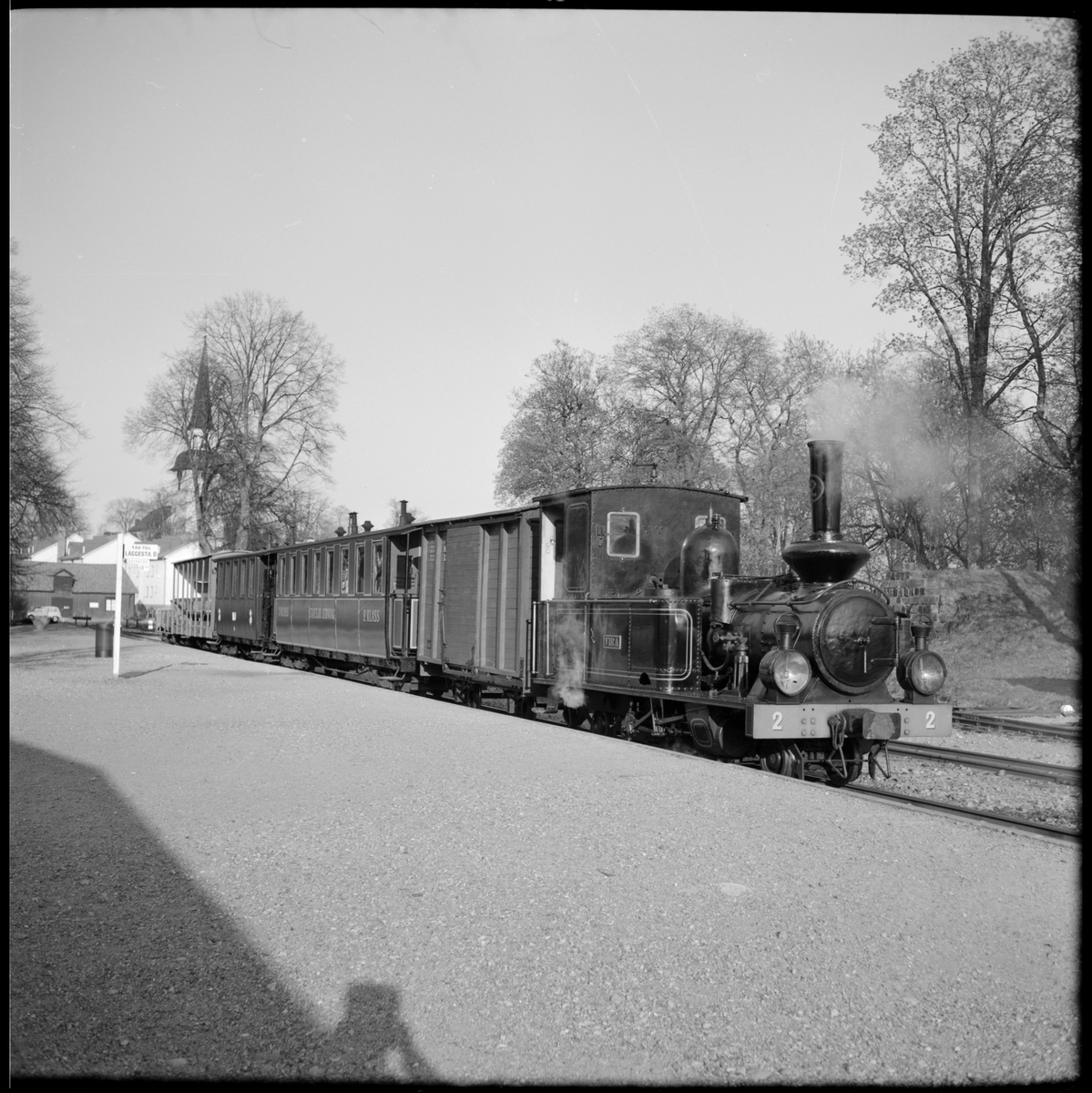 Museijärnvägen, Östra Södermanlands Järnväg, ÖSlJ ångtåg med Kosta - Lessebo Järnväg, KLJ G 29, lok 2 "Virå", Stafsjö Järnväg 2:a och 3:e klass vagn, Munkedals Järnväg, MJ 3:e klass vagn och öppen personvagn på stationen i Mariefred.