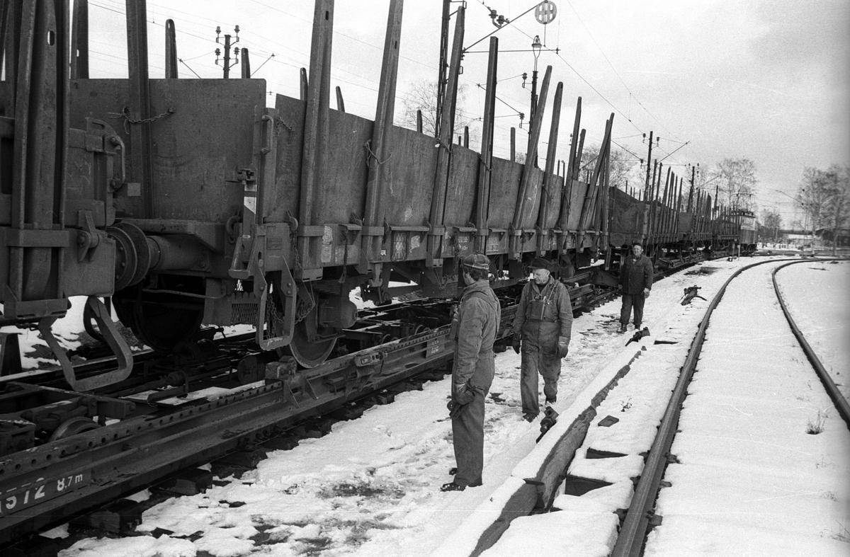 Karlstads trafikområde. Normalspåriga godsvagnar lastade på smalspårig överföringsvagn från Nordmark - Klarälvens Järnvägar, NKlJ.