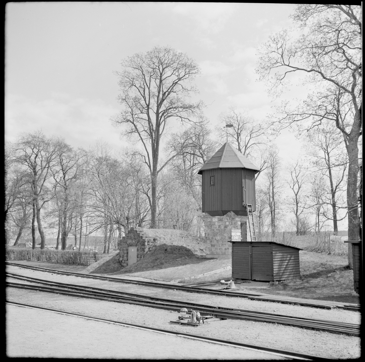 Vattentorn och jordkällare bredvid spåret i Mariefred som användes av Museijärnväg Östra Södermanlands Järnväg, ÖSlJ.