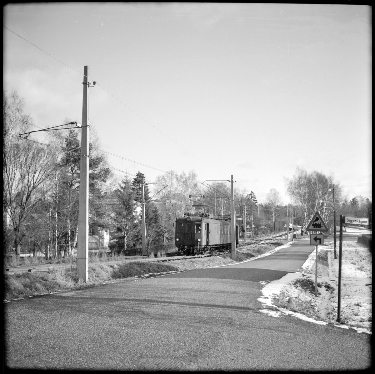 Troligen Stockholm-Roslagens Järnvägar, RSJ X3p 35 "träburkar" vid korsningen Valevägen och Sigynvägen, Djursholm i Stockholm.