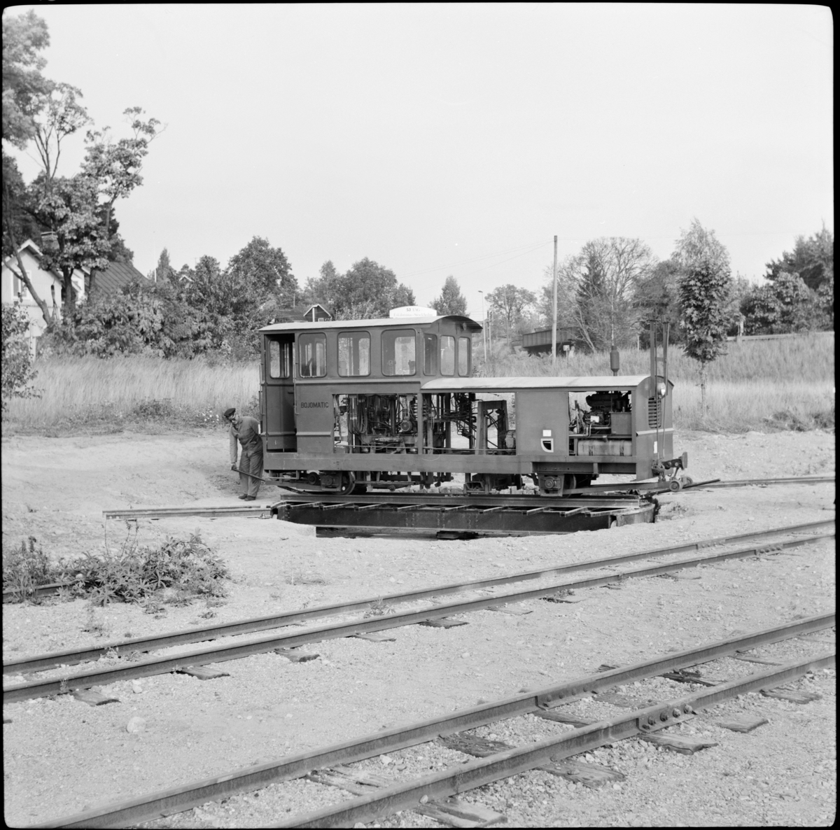 Banjusteringsfordonet "Bojomatic" på vändskivan vid Östra Södermanlands museijärnväg.