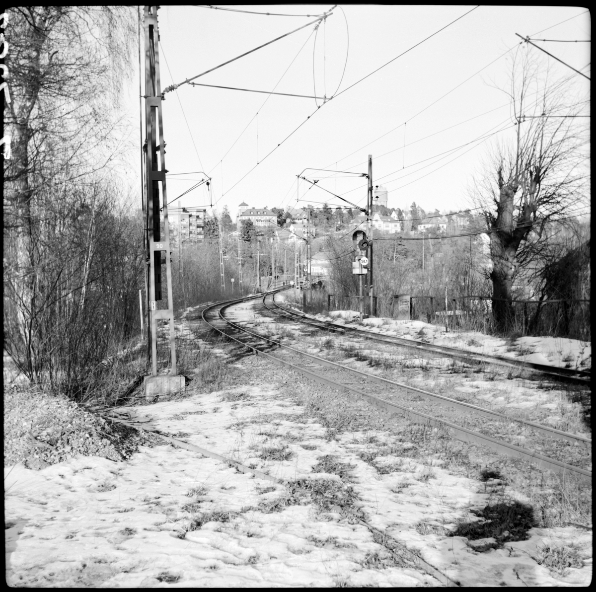 På linjen mellan Freskati och Stocksund efter Roslagsbanan. Längre fram ser vi järnvägsbron över Stocksundet.