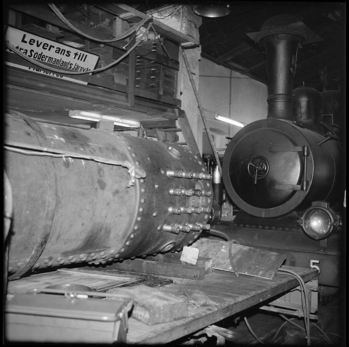 Fronten på Museijärnvägen, Östra Södermanlands Järnväg, ÖSlJ lok 5 "Hamra", och del av en ångpanna.