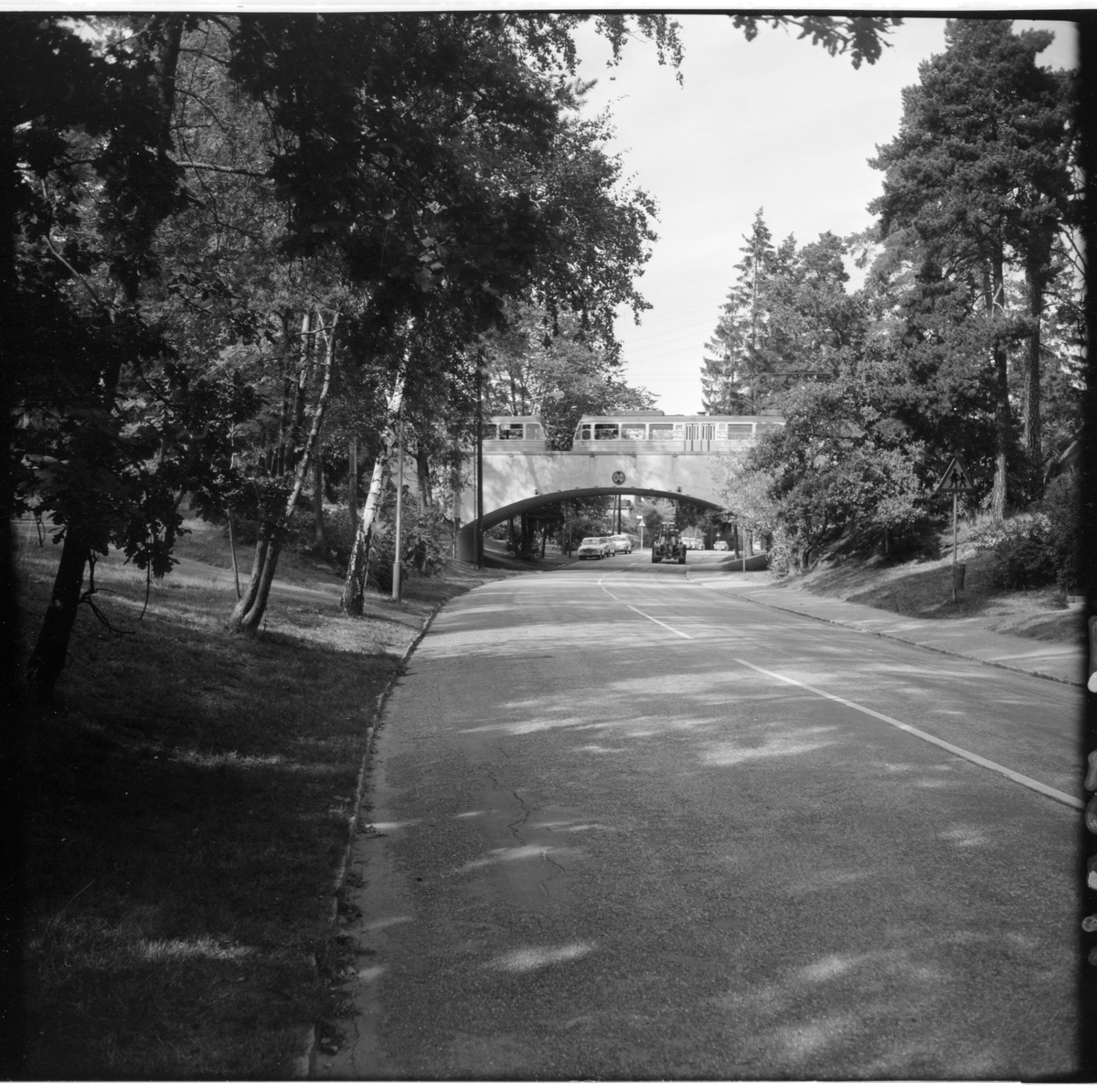 Viadukt med Aktiebolaget Stockholms Spårvägar, SS spårvagnar linje 12 på bron vid Djupdalsvägen.