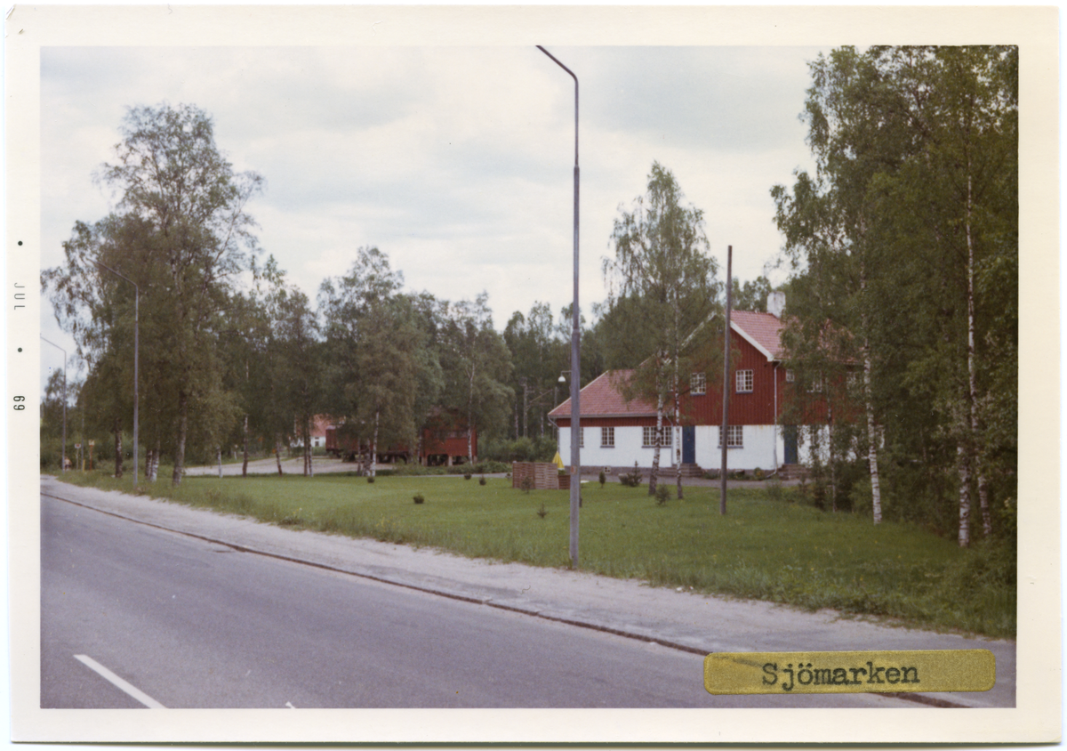 Vy vid Sjömarken. Stationen byggd 1913.Det anlades också en park- och badanläggning, driven av GBJ,Göteborg-Borås Järnväg fram till 1936, då den såldes till Borås stad. Persontrafiken nedlades fr o m 12 maj 1968 och godstrafiken fr o m 1 september 1974. Växeln till stickspåret borttogs i december 1975