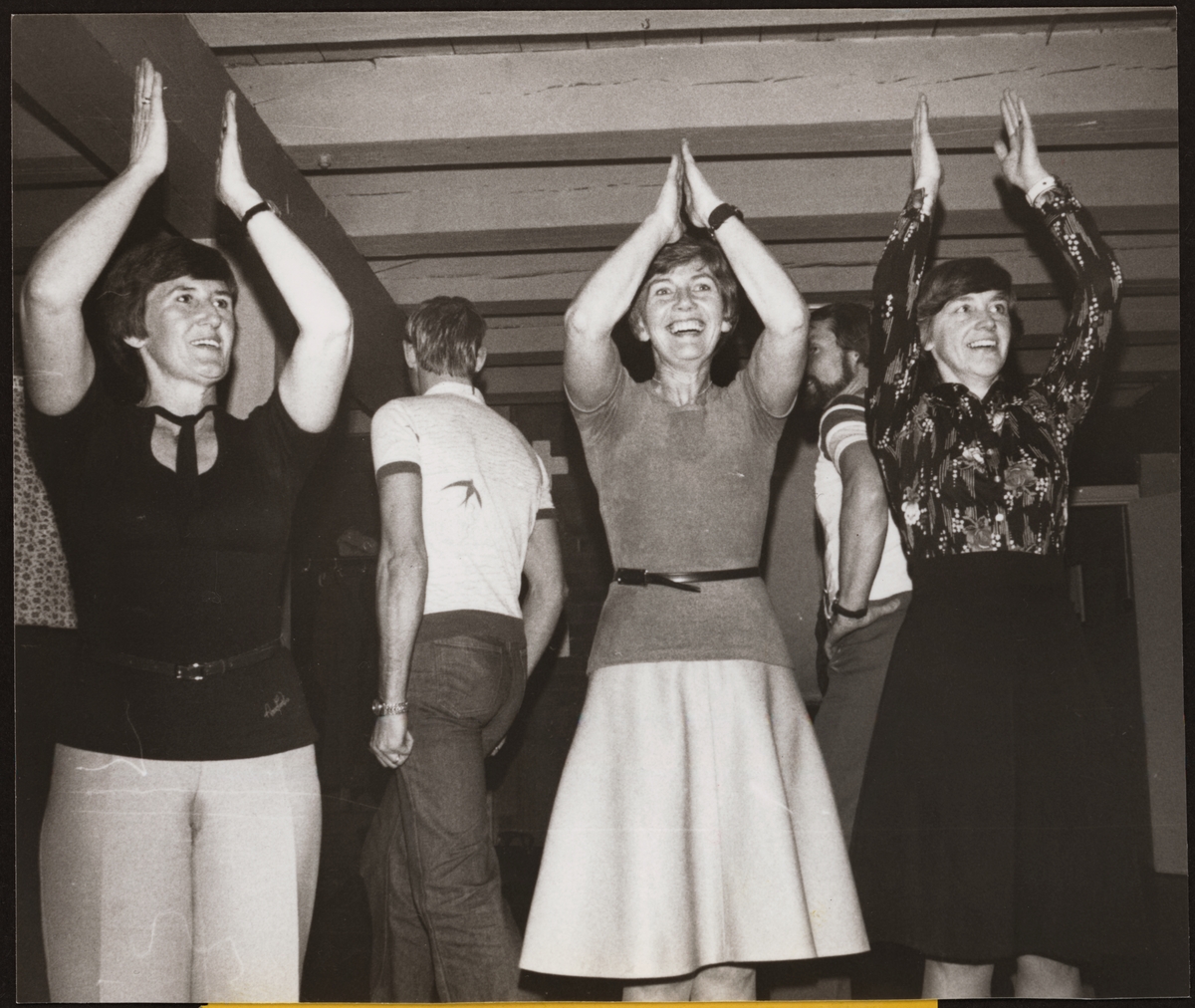 Trafikaktiebolaget Grängesberg - Oxelösunds Järnvägar, TGOJ anordnar motionsdans. På bilden ser vi från vänster Ulla-Britt Parnesten, Irene Adolfsson och Kerstin Andersson mitt uppe i en Tjeckisk Polka. Dansandet skedde i Skjulstastugan, strax söder om Eskilstuna.