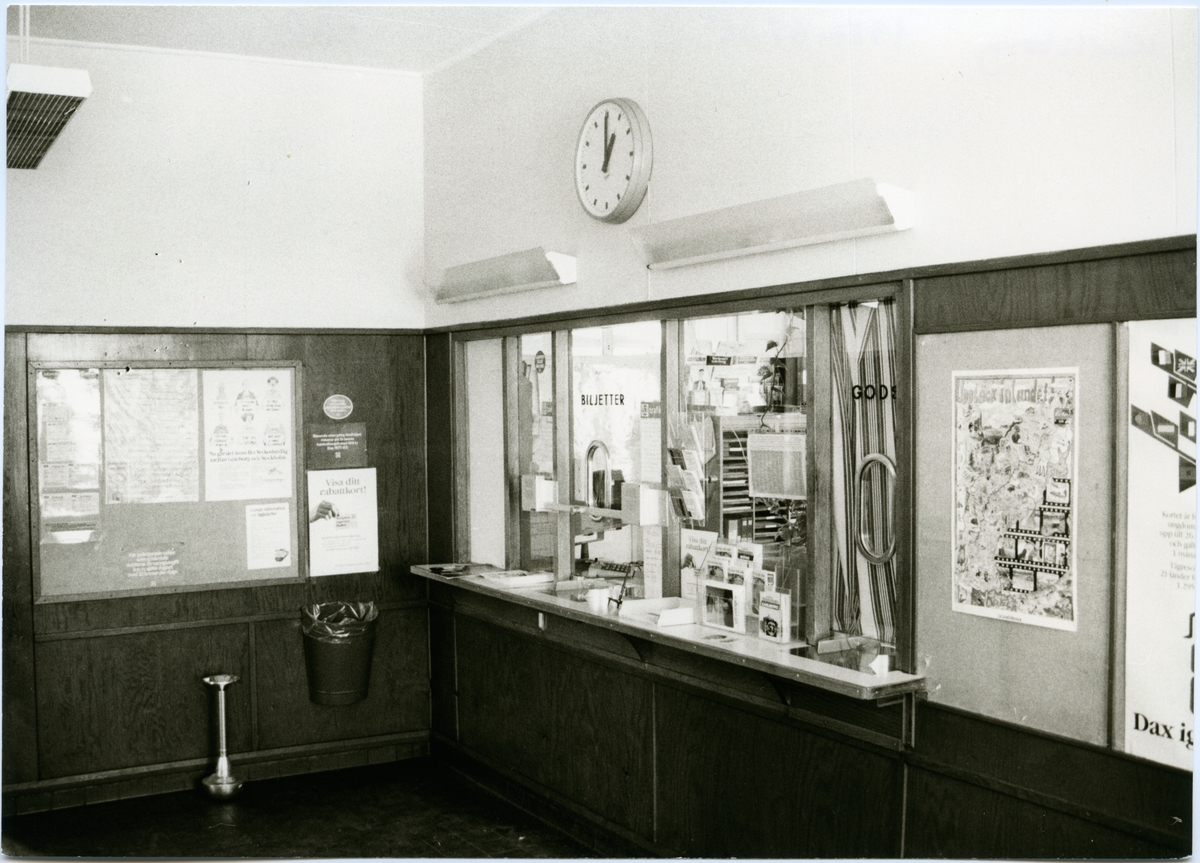 Karlsborgs Stationshus. Väntsal/biljettförsäljning klockan 13.00 torsdagen den 5:e maj 1986