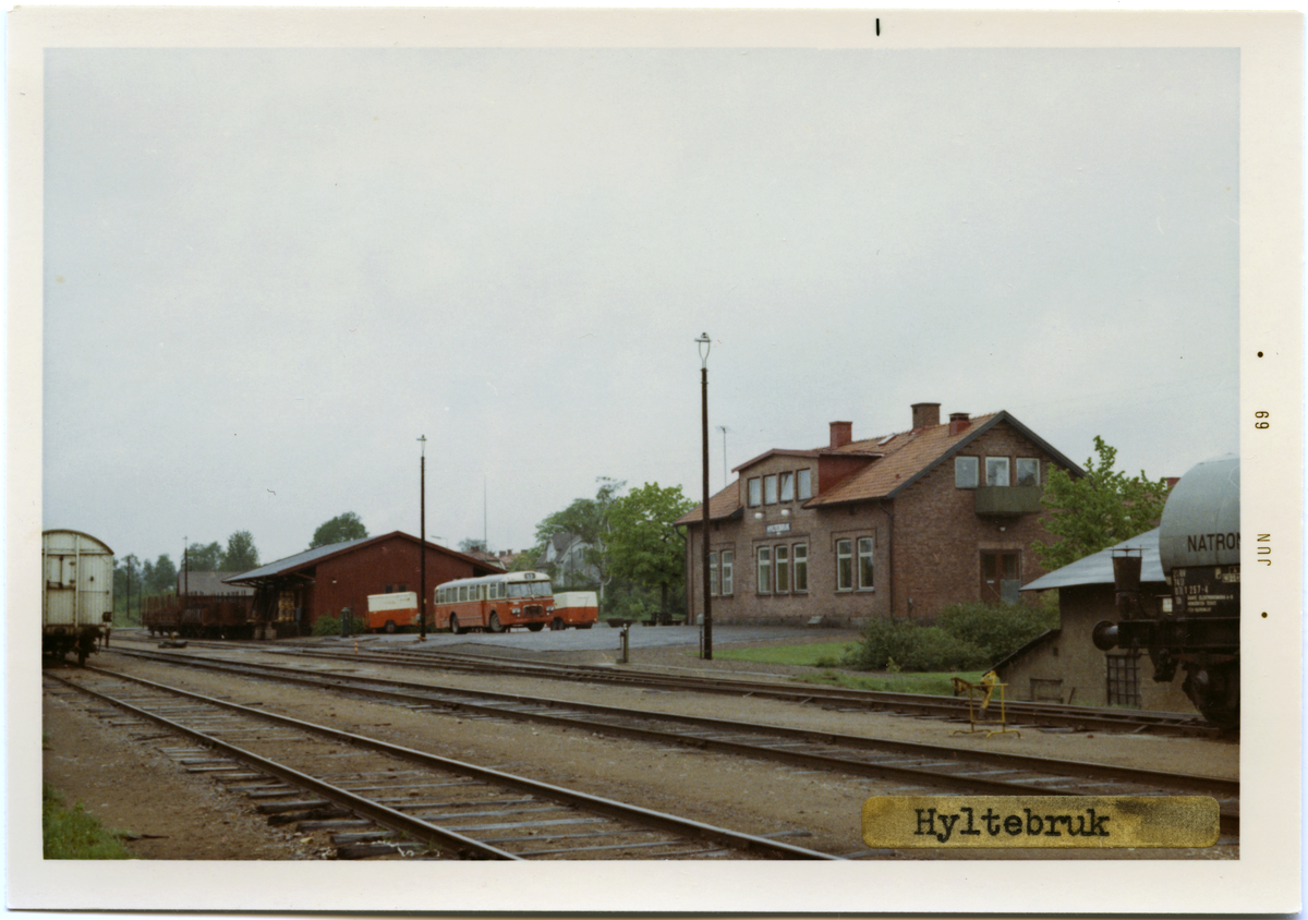 Vy över Hyltebruks Station. Godsvagnar och tankvagn SJ 1257-4 står på spåret intill stationsbyggnaden. Vi ser även en buss med släp intill en tankstation.