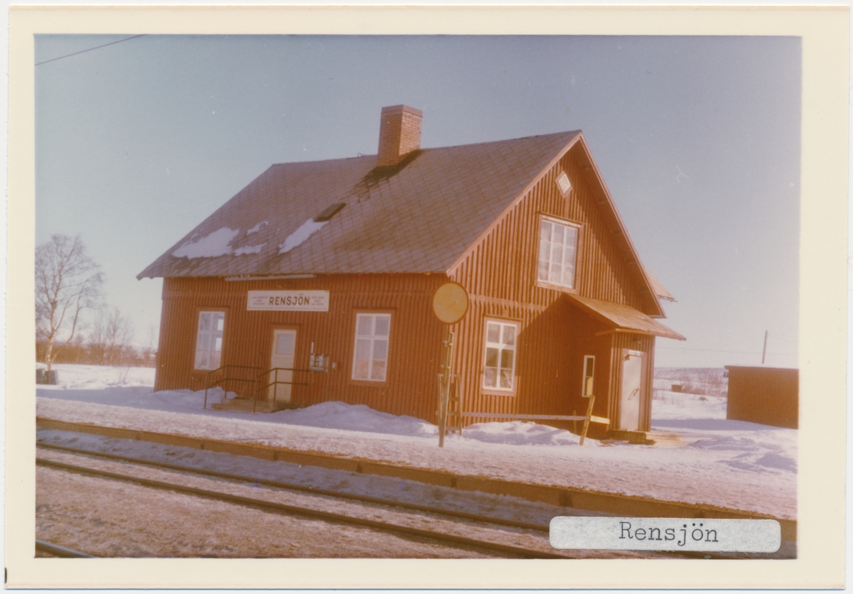 Vy vid Rensjön. Trafikplats anlagd 1908. Envånings stationshus i trä. Elektrifiering 1915.
