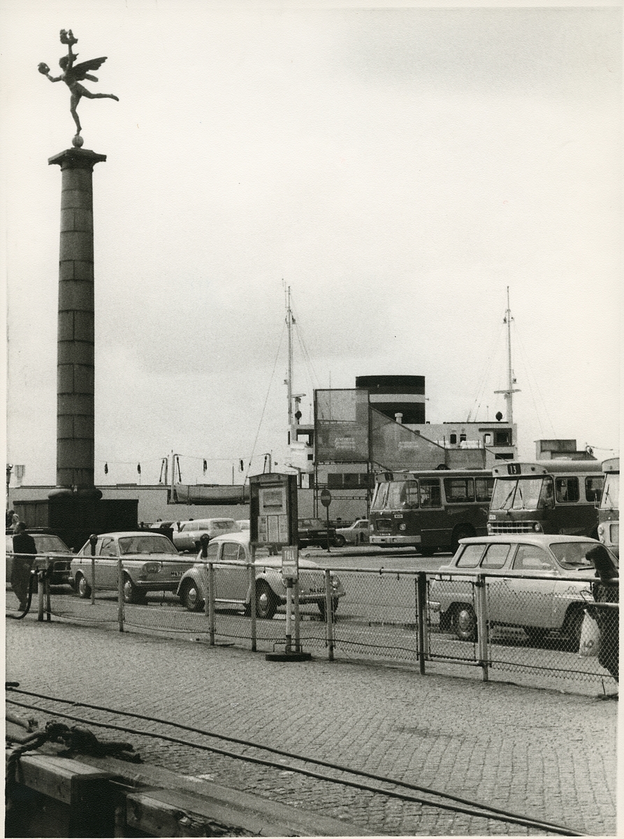 Helsingborg F (färjestation). Till vänster monumentet Sjöfartsgudinnan.