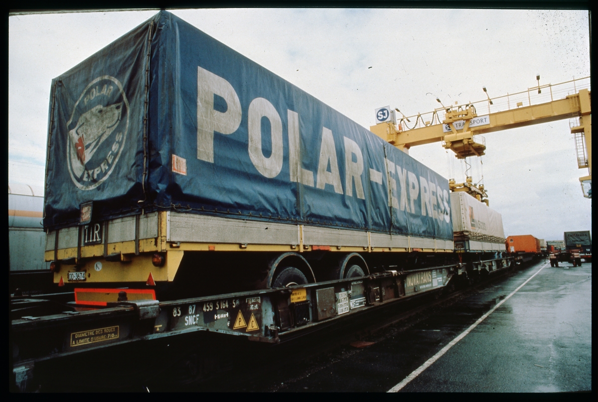 Lastning av släp med containerkran. SNCF Sdgkmss 83-87-459 3 164-5. France Societe Nationale des Chemins de fer Francais