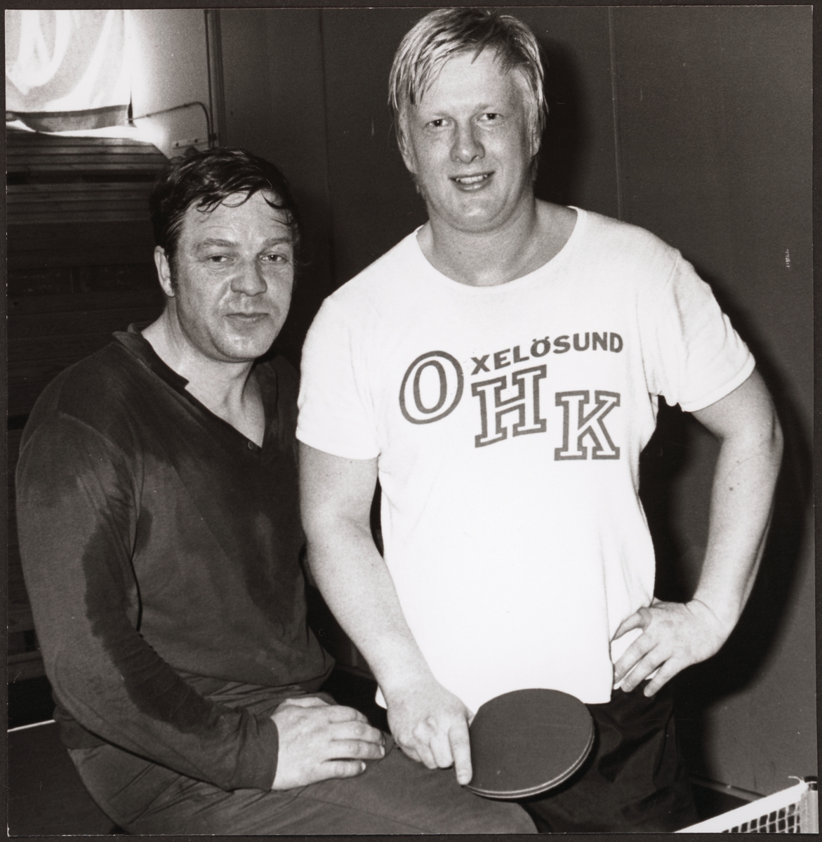 Från vänster S G Åkerblom, Lindesberg och Göran Lund, Oxelösund, efter en bordtennismatch i motionsklassen. Järnvägens idrottsförening.