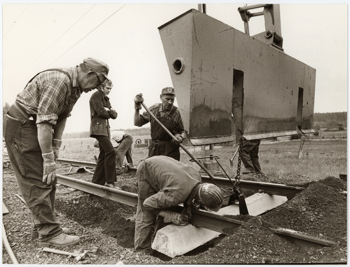 Byte till betongsliper på linjen. Lars Olsson, Henning Eriksson och Rune Dahlman installerar och Ingenjör Lars Bergkvist från Lesjöfors AB övervakar.