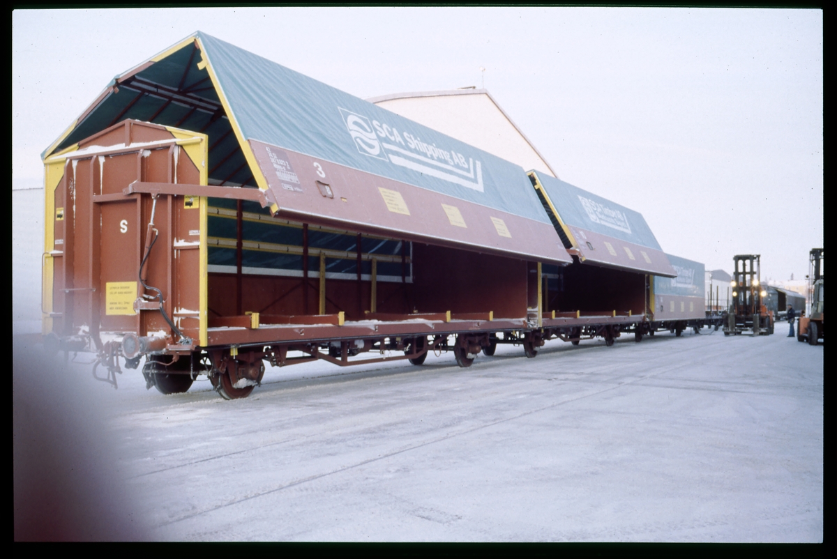 Statens Järnvägar, SJ Hbins-u. typ 853. Godsvagn med öppningsbar sida märkta SCA Shipping AB.
