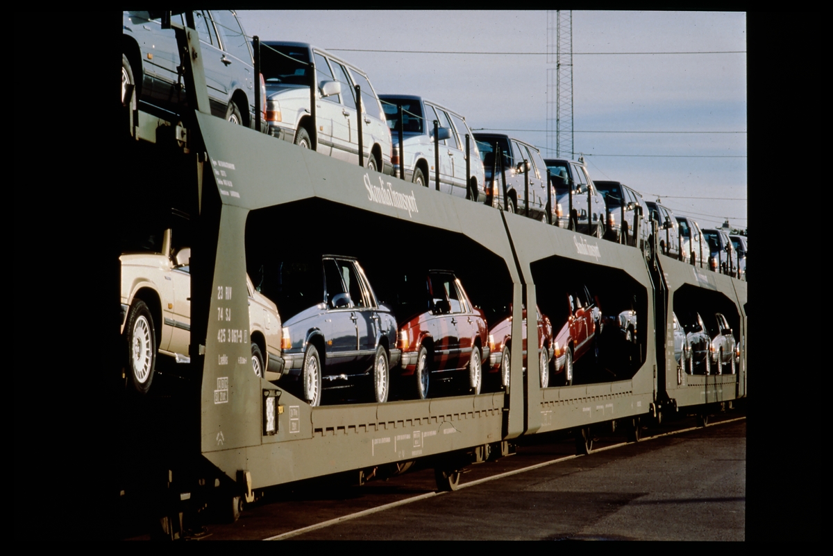 Statens Järnvägar, SJ Laekks 23 74 425 3 067-9, lastad med personbilar.