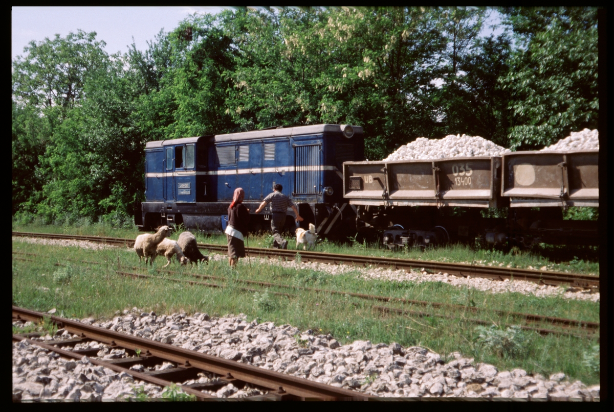 Diesellok L45H-080 med godsvagnar lastade med kalksten på bangården vid Tomani station, Rumänien.