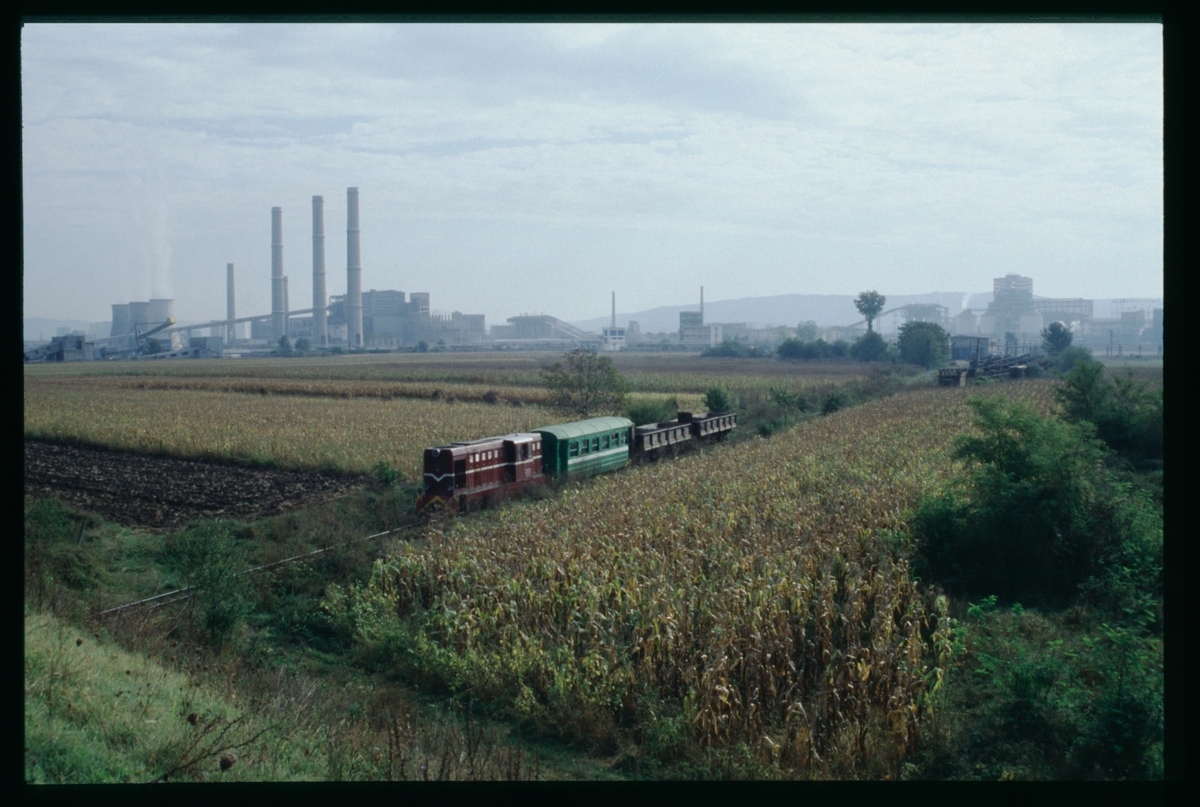 Dieselloksdraget tåg i Govora, Rumänien. I bakgrunden syns sodafabriken.
