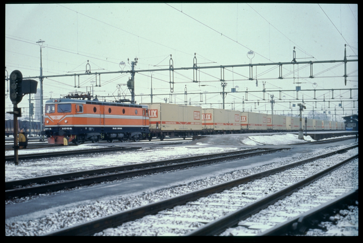 Rc2 1044 med godståg bestående av öppna vagnar. Vagnar lastade med containers märkta Felix.
