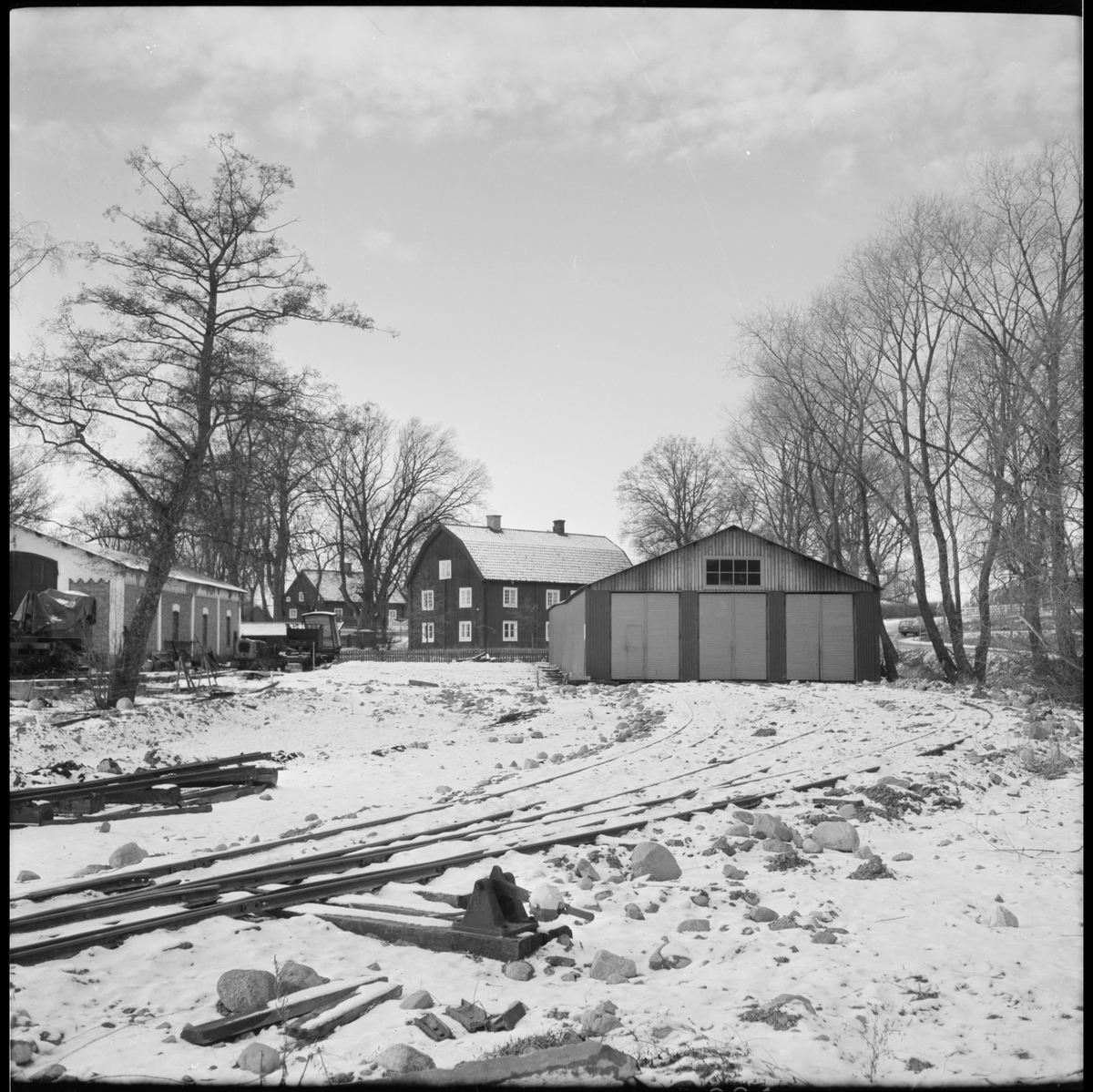 Verkstaden i Mariefred som användes av Museijärnväg Östra Södermanlands Järnväg, ÖSlJ till höger i bild. Och lokstallet till vänster i bild.