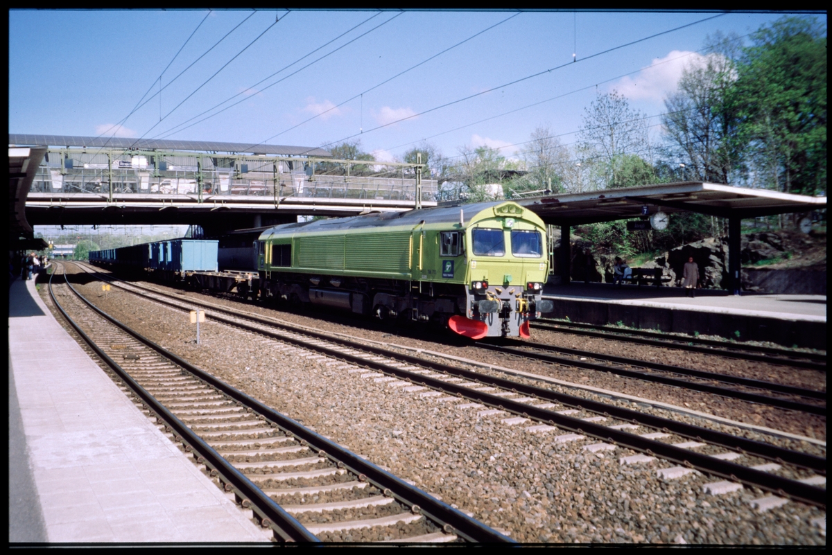 Tfv Grängesberg - Oxelösunds Järnvägar, TGOJ T66 713 med godsvagnar vid Älvsjö station.
